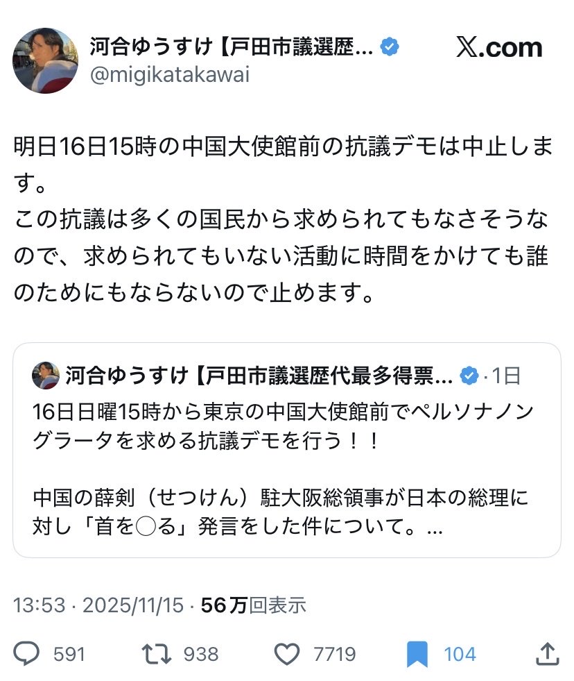 中国大使館前デモ、中止 1: ダルナビルエタノール(茸) [CN] 2025/11/15(土) 21:48:... -