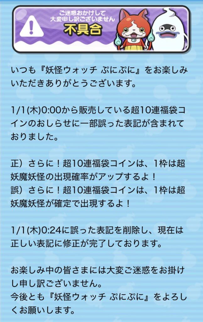 【悲報】妖怪ウォッチのソシャゲ、新年早々やらかす
