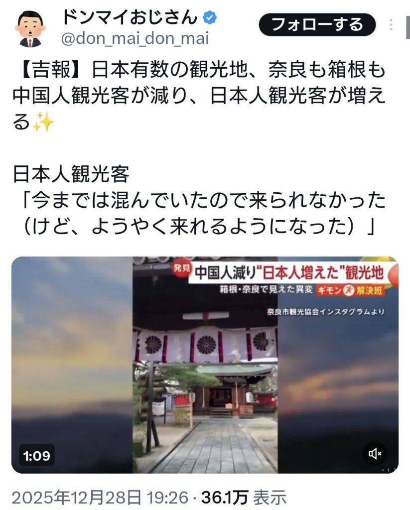 中国人が減り“日本人が増えた”観光地 1: ポテくん(東京都) [US] 2025/12/29(月) 20... -