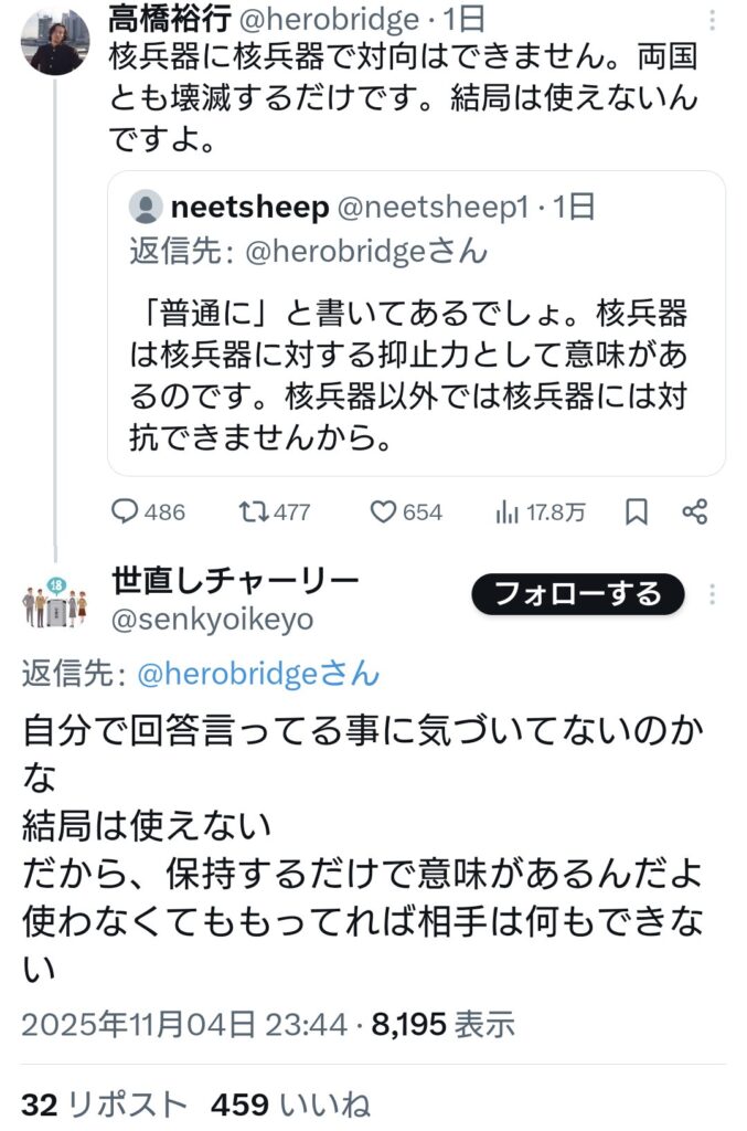 パさん「核兵器に核兵器で対向はできません。両国とも壊滅するだけです。結局は使... -
