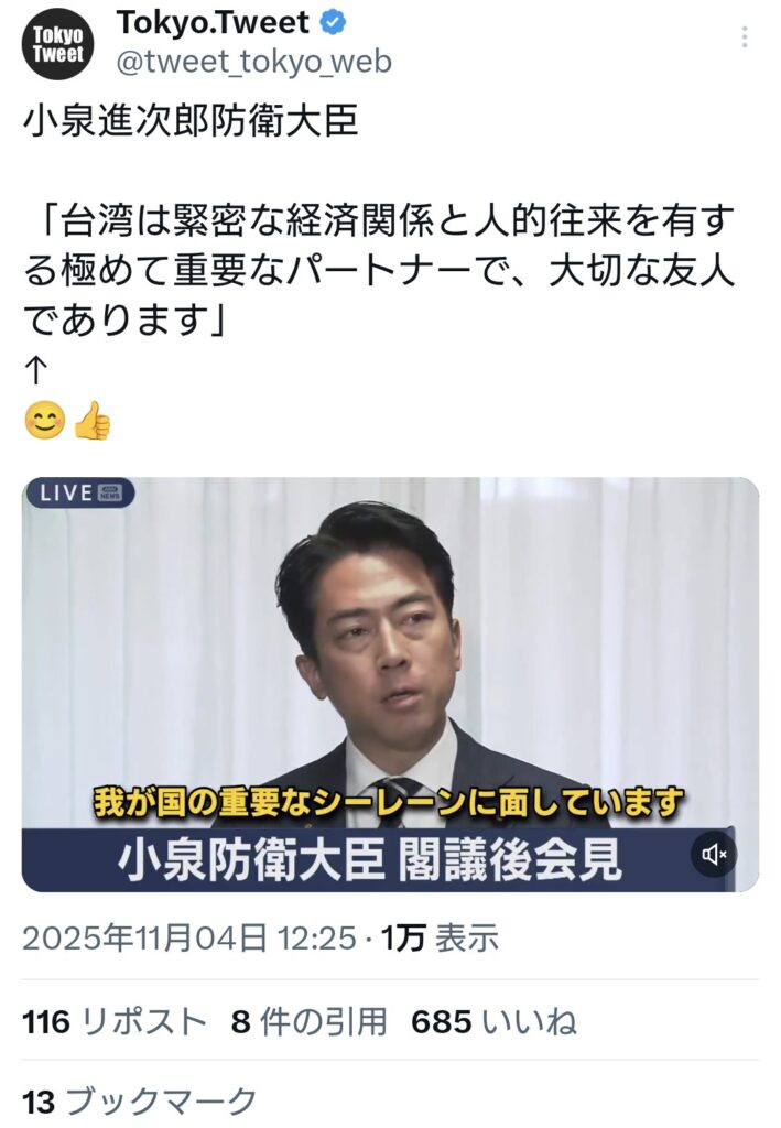 小泉防衛大臣「台湾は極めて重要なパートナーで大切な友人であります」 1: ヘルペ... -