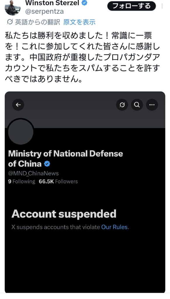 中国国防省のXアカウントが凍結された件。荒らし認定されたか