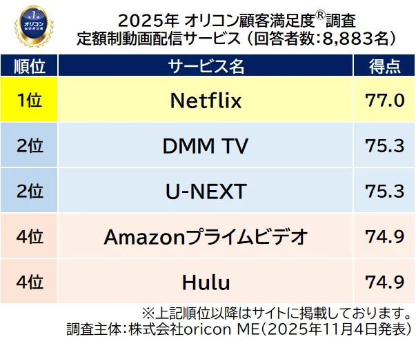 動画配信サービス満足度 1位は「Netflix」 2位は「U-NEXT」と「DMM 」が同点