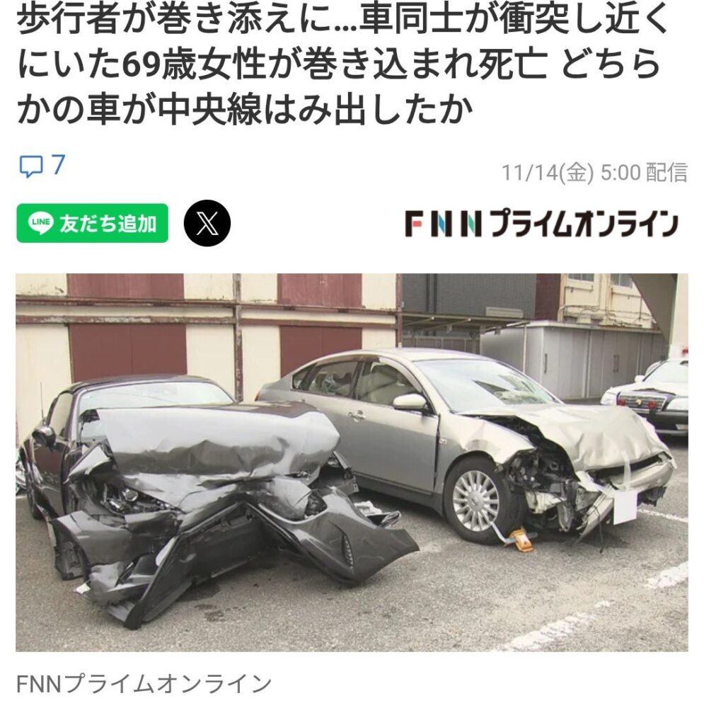 43歳と80歳。お前らはどっちが殺したと思う?車カスの衝突で歩行者死亡。ロードスターと日産ティアナ