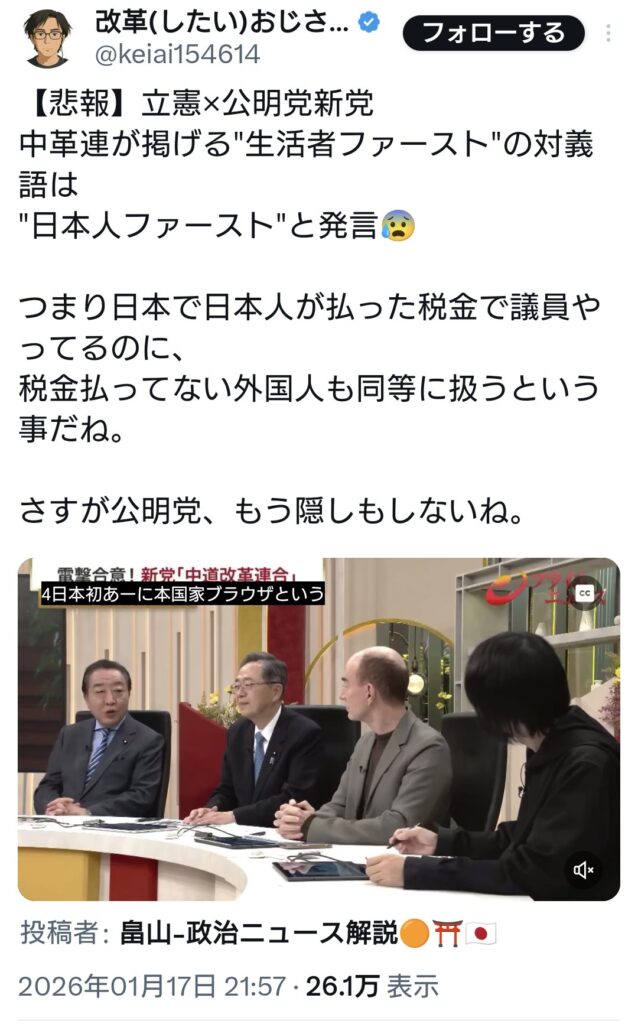 中革連が掲げる”生活者ファースト”の対義語は“日本人ファースト”