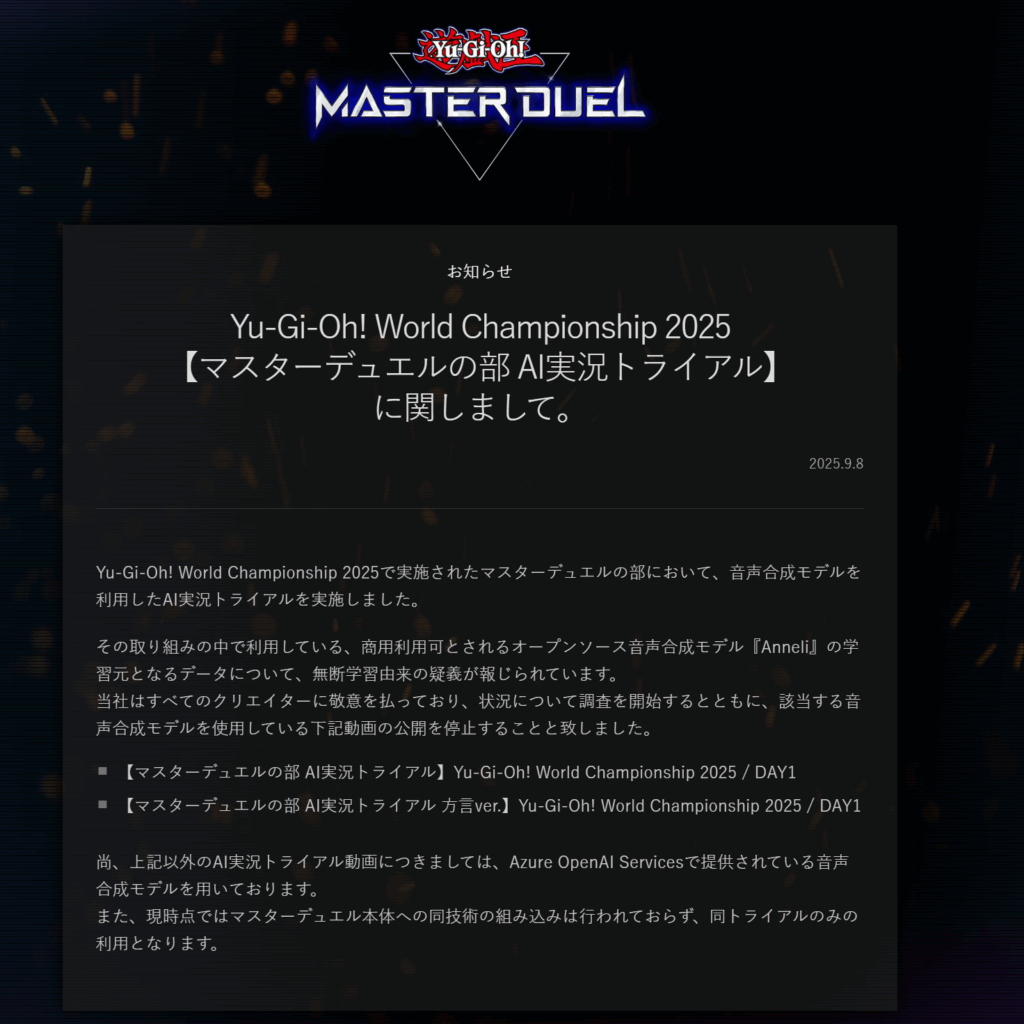 コナミ、人気声優の声を無断でAIに学習させたAI実況動画を削除