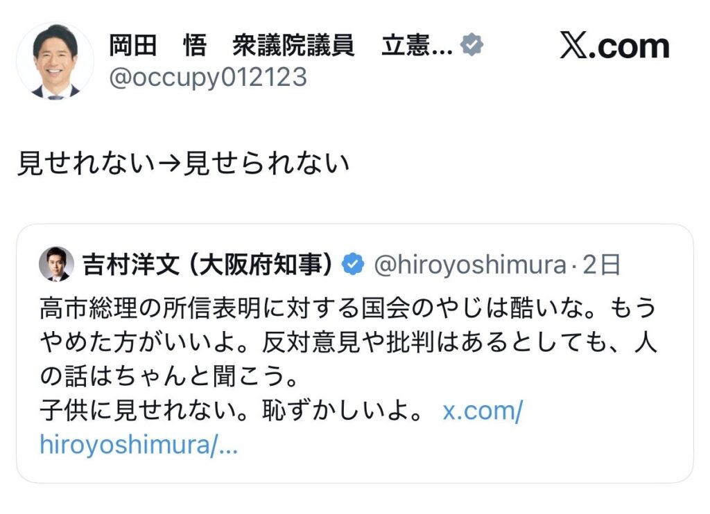 国会ヤジ騒動渦中の立憲・岡田悟議員、吉村知事に「ら抜き言葉」指摘「見せれない→見せられない」