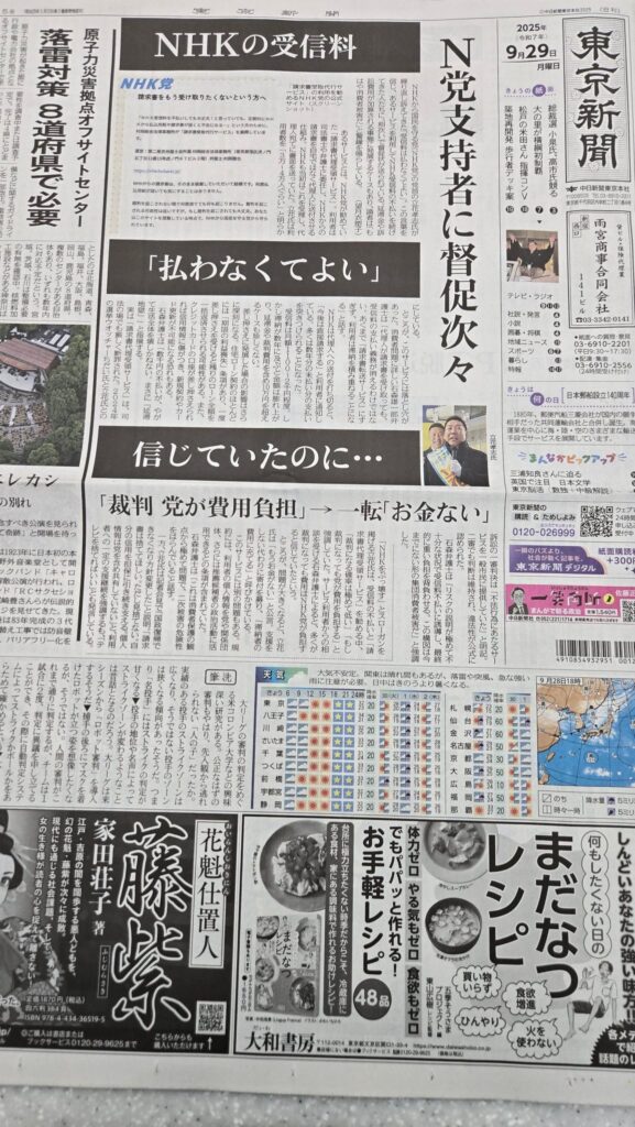 新聞一面「NHK受信料払わなくて良い、信じていたのに… N党支持者に督促状続々。」