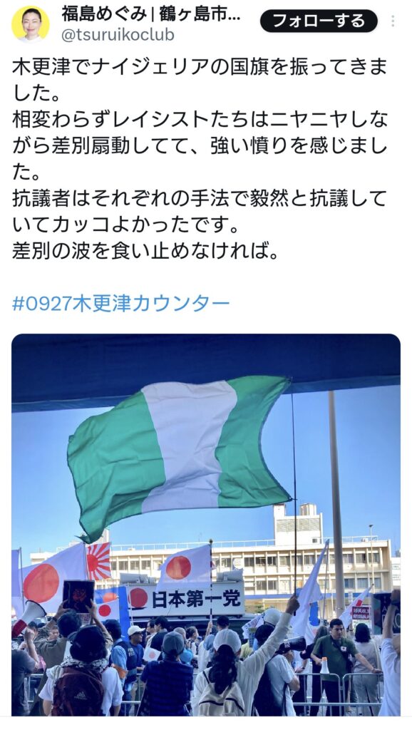 福島めぐみ議員「木更津でナイジェリアの国旗を振ってきました。レイシスト達には強い憤りを感じる」