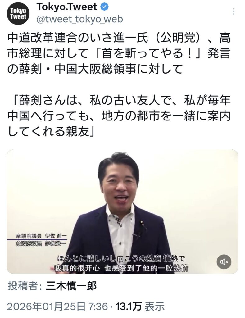 中革連のいさ進一氏(公明党)、首を斬ってやる!の薛剣氏に対し「私の古い友人で、... -