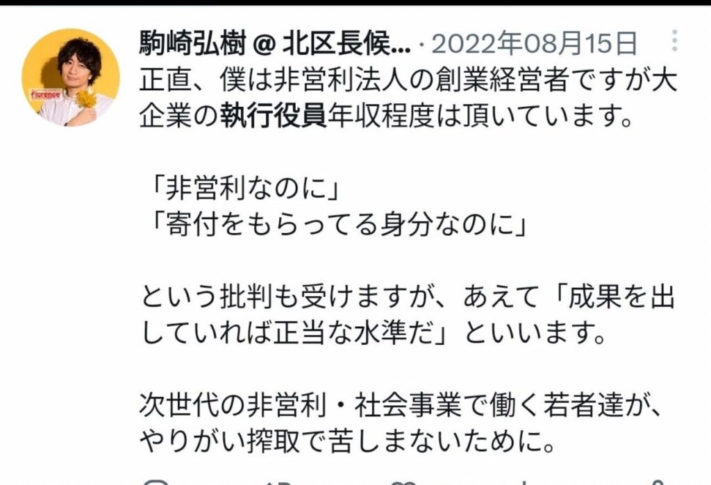 【悲報】NPO代表「大企業の役員程度の給料は頂いてます。若者がやりがい搾取で苦しまない為にね」