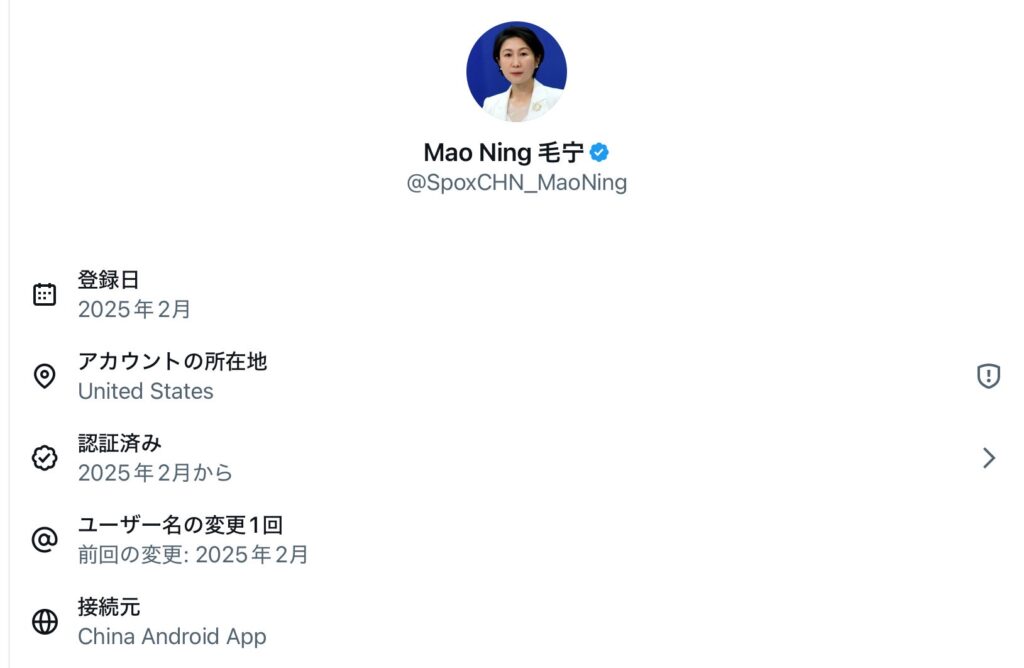 中国の毛報道官、Xの投稿でVPNを利用し、発信元が「アメリカ合衆国」になっている... -