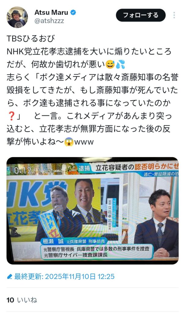 【画像】兵庫県民「立花さんの情報で真実を知った。ネットやSNSに真実が書いてある... -