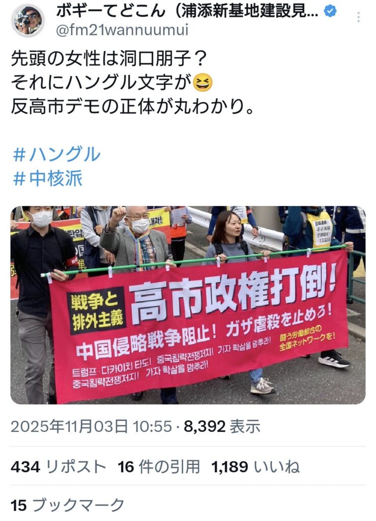 何故か反高市デモにハンクル文字が 1: アコレプラズマ(東京都) [CA] 2025/11/03(月... -