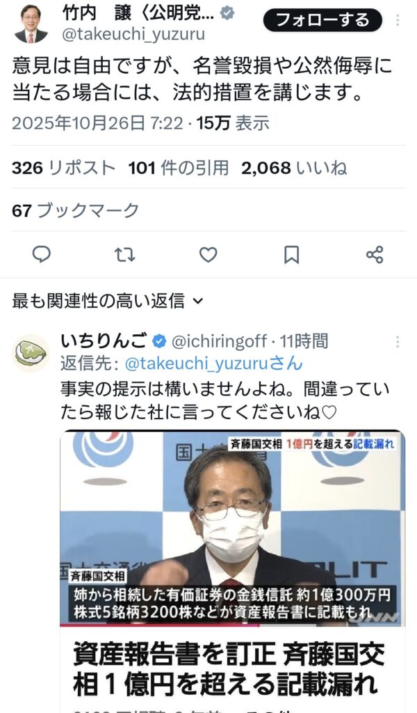 公明党議員「意見は自由ですが、名誉毀損や公然侮辱に当たる場合には、法的措置を... -
