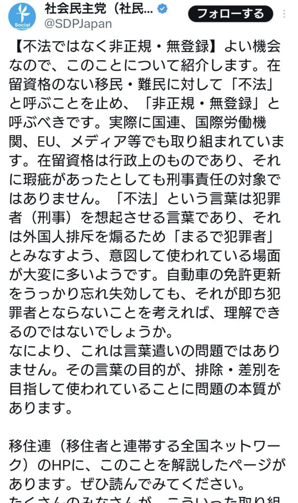 社民党「”不法”移民と呼ぶことを止め”非正規・無登録”移民と呼ぶべきです」