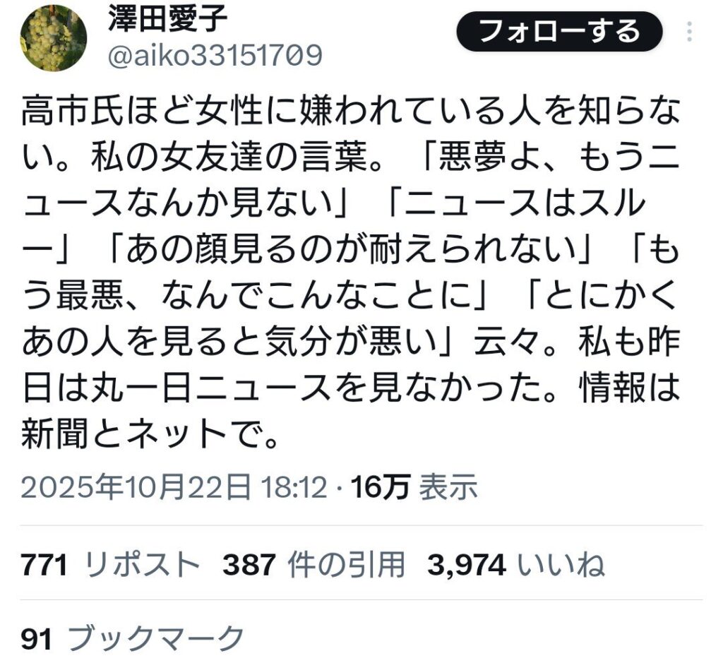 パさん「高市氏ほど女性に嫌われている人を知らない。」 →?