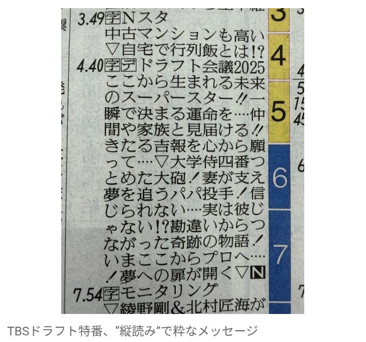 【TBS】ドラフト特番、新聞のテレビ欄に『縦読み』で粋なメッセージ SMAPの楽曲タ... -