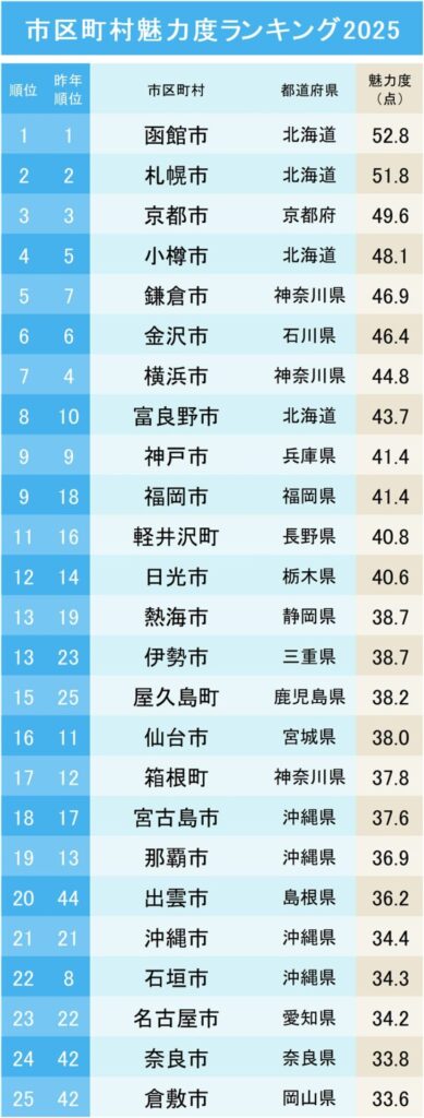 市区町村魅力度ランキング2025!3位京都市、2位札幌市、1位は函館市