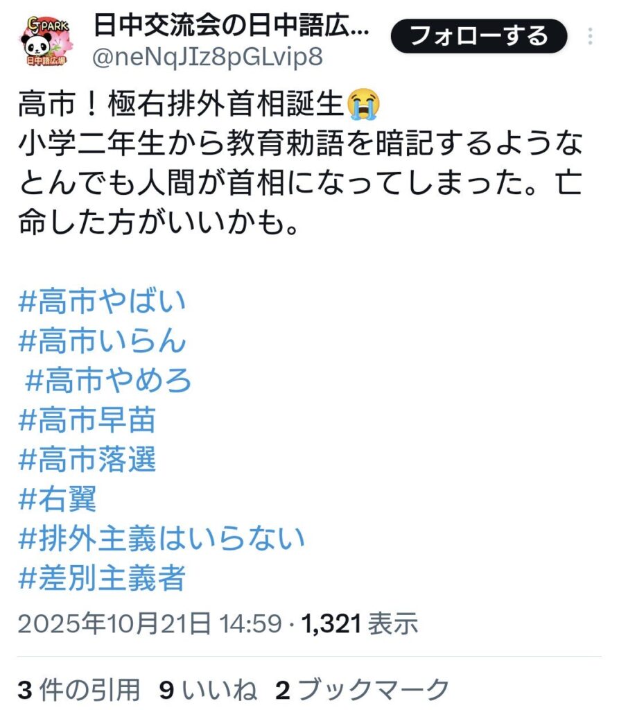日中交流会の主催者「高市!極右排外首相誕生😭亡命した方がいいかも」
