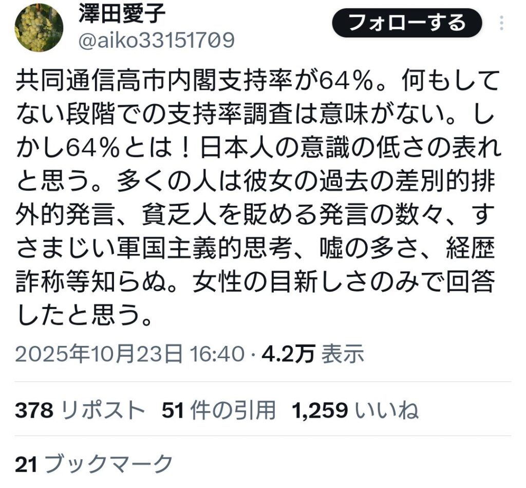 パさん「高市内閣支持率が64%とは!日本人の意識の低さの表れと思う。」 →? 1: ... -