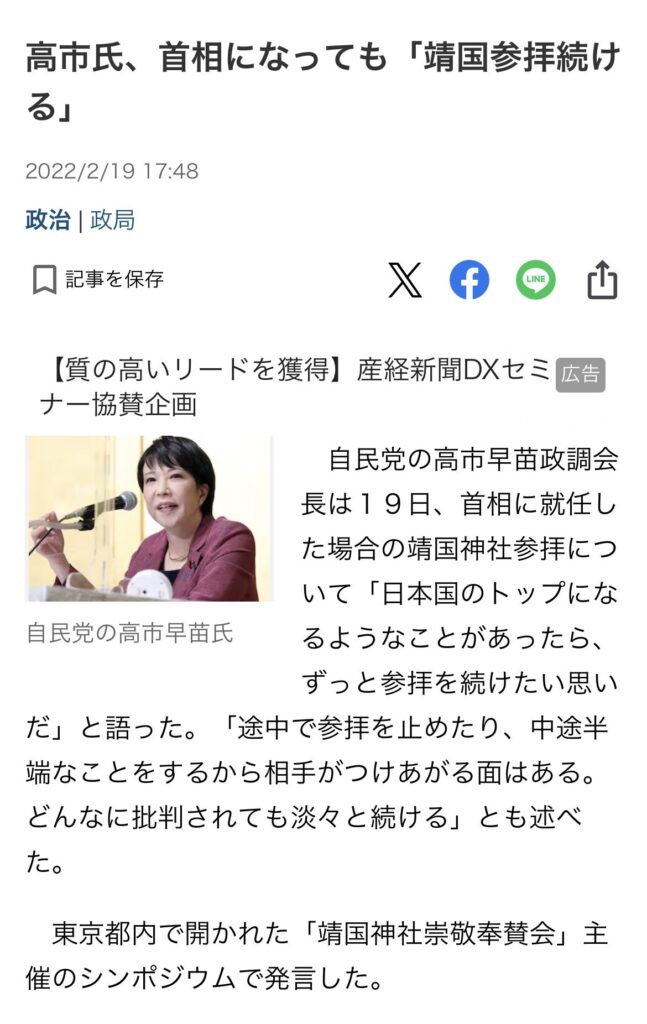 「靖国絶対参拝」「国の品格に関わる」が総裁になった途端「中韓に配慮します」真逆になった高市早苗に不信 →??