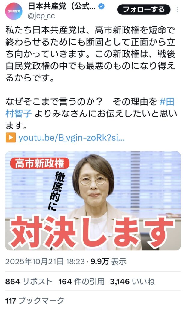 共産・田村委員長「高市新政権を短命で終わらせるためにも断固として正面から立ち... -