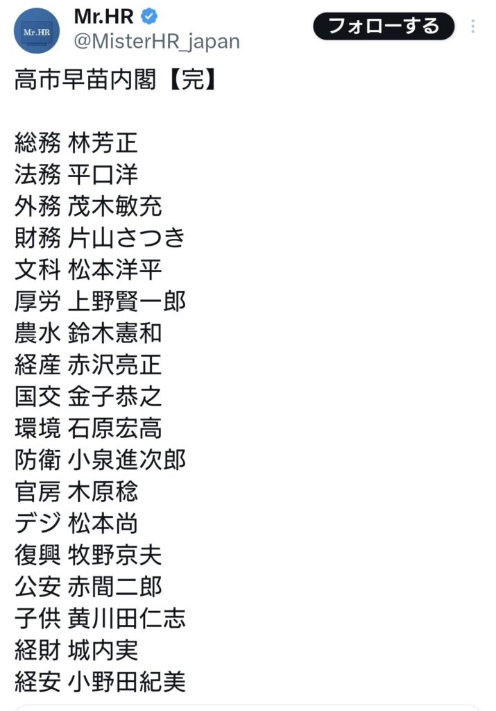 高市新内閣が閣僚名簿を発表 1: はくちょう座X-1(和歌山県) [ヌコ] 2025/10/21(火) 1... -