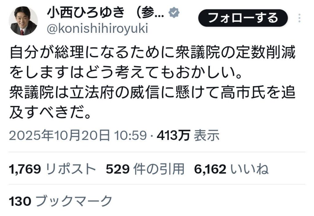 立憲・小西氏「自分が総理になるために衆議院の定数削減をしますはどう考えてもお... -