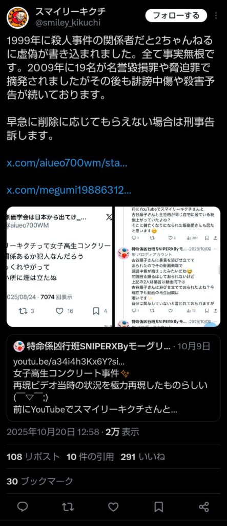 【悲報】aiueo700、スマイリーキクチから刑事告訴へ 1: 馬頭星雲(茸) [KR] 2025/10... -