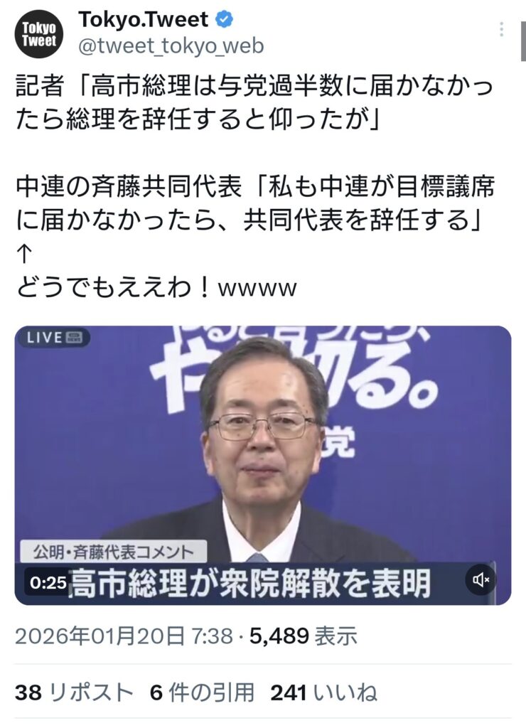 中革連・斉藤氏「私も中連が目標議席に届かなかったら共同代表を辞任する」 ←どうでもええわ