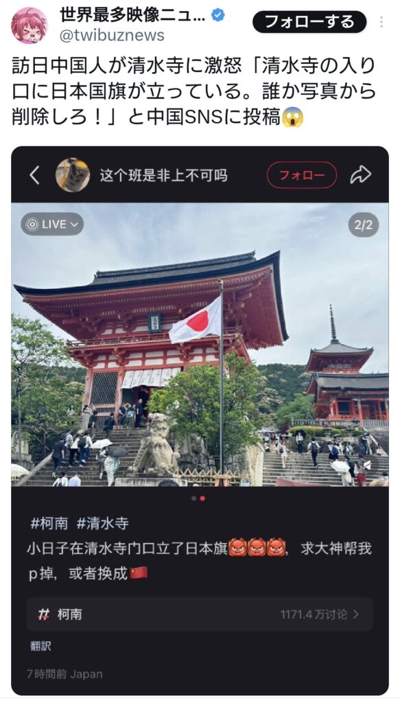 訪日中国人が清水寺に激怒「清水寺の入り口に日本国旗が立っている。誰か写真から... -