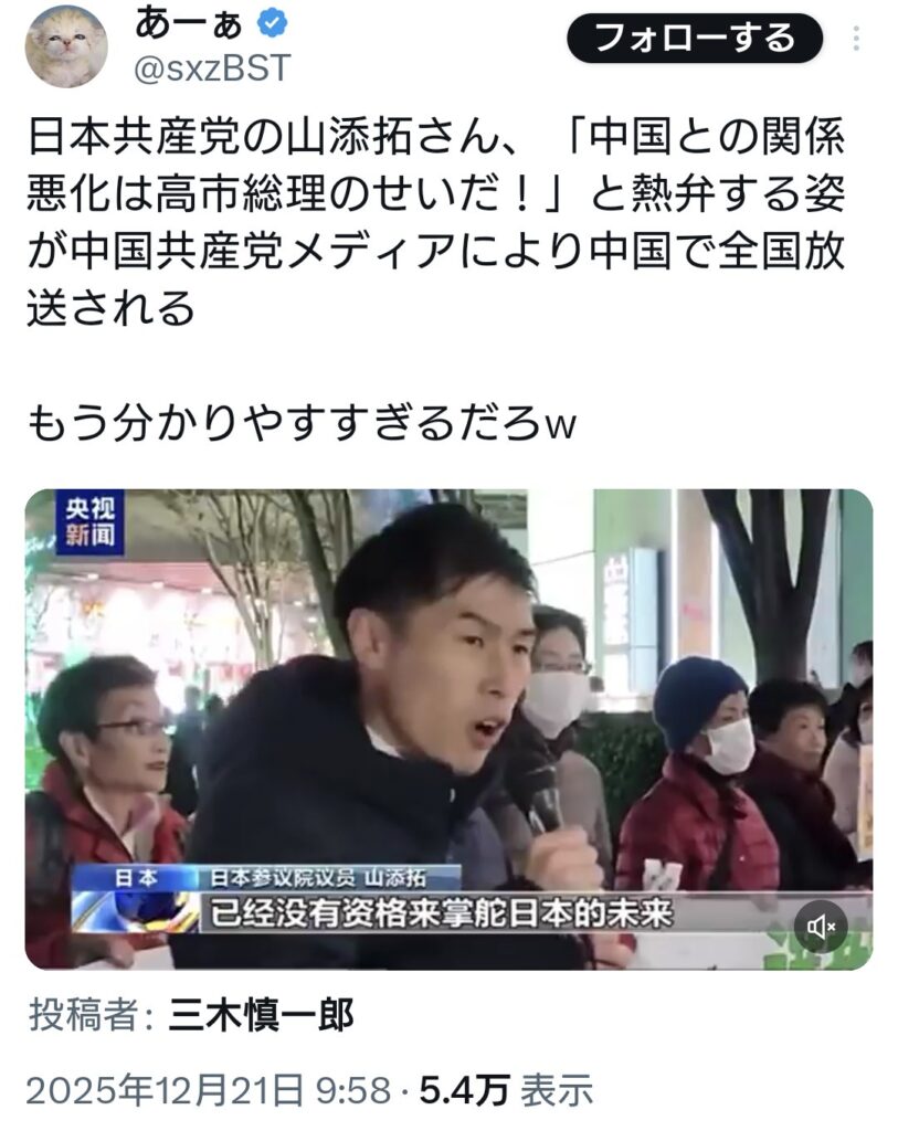 共産党・山添氏「中国との関係悪化は高市総理のせいだ!」演説が中国メディアによ... -