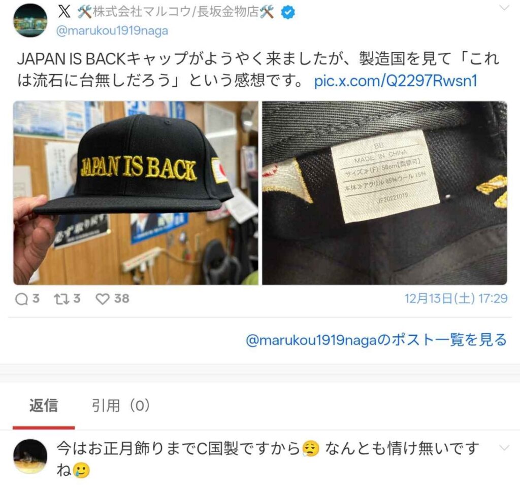 高市早苗公式帽子を買ったネット保守、メイドインチャイナで号泣