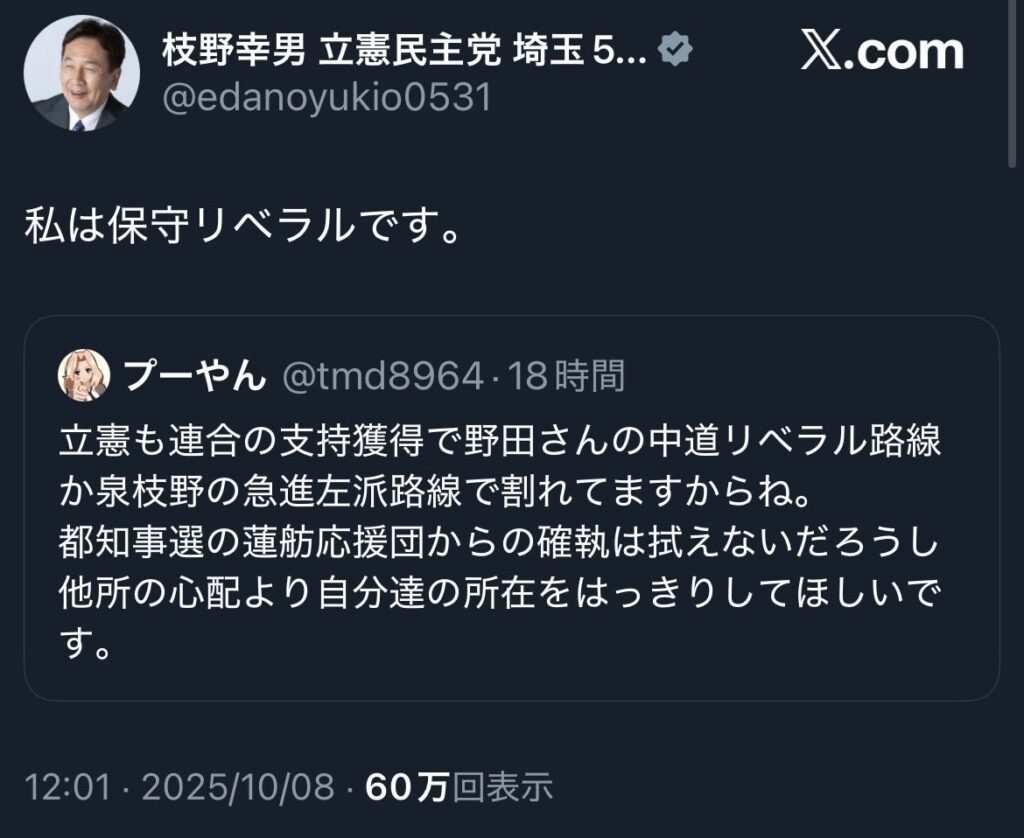 立憲・枝野氏「私は保守リベラルです」 1: ホックン(愛知県) [US] 2025/10/10(金) ... -