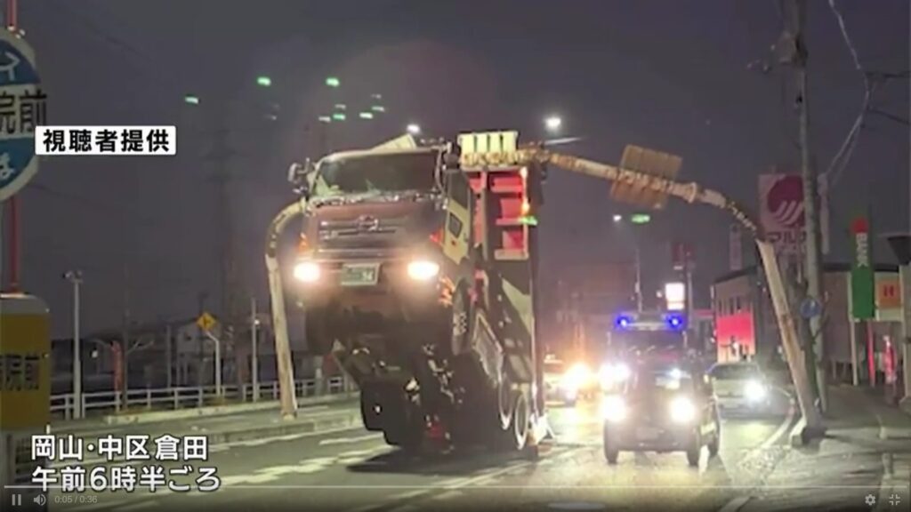 宙に浮くダンプ、荷台が道路標識に衝突 ダンプカーが荷台を上げたまま走行したか ... -
