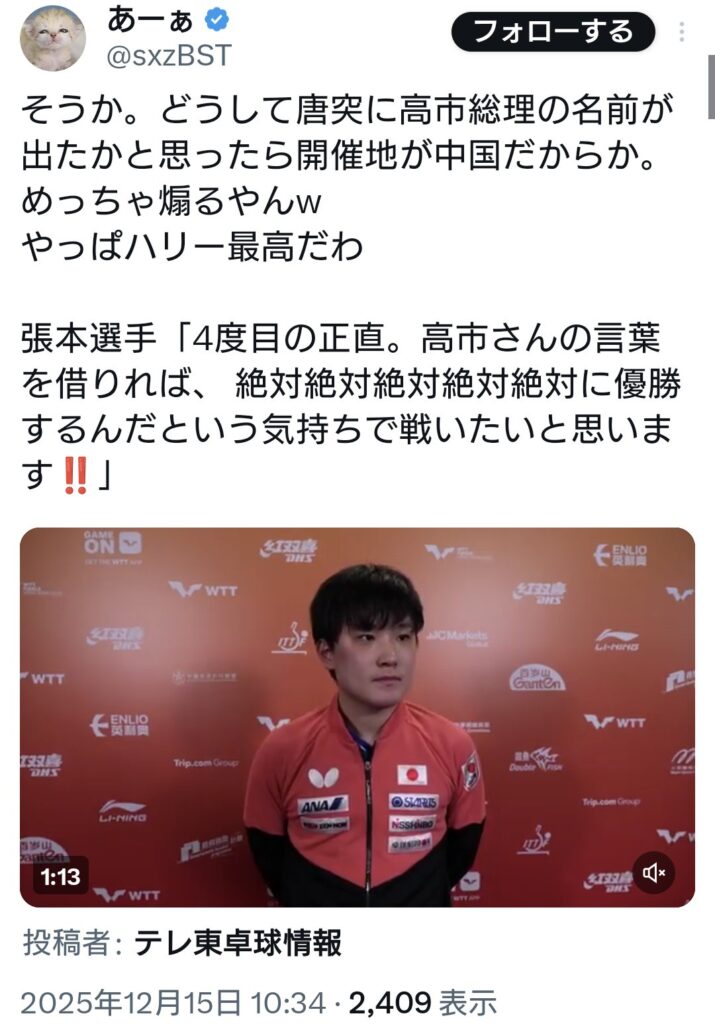 張本選手「高市さんの言葉を借りれば、 絶対絶対絶対絶対絶対に優勝するんだという... -
