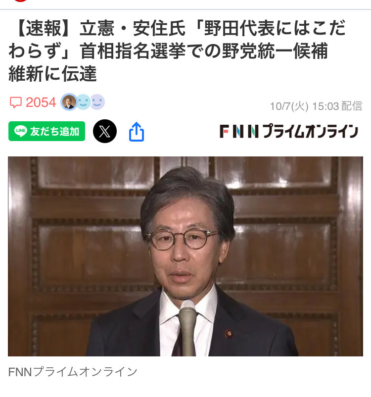 立憲・安住幹事長 首相指名選挙で野党統一候補は「玉木代表も有力」 1: 少考さん ... -