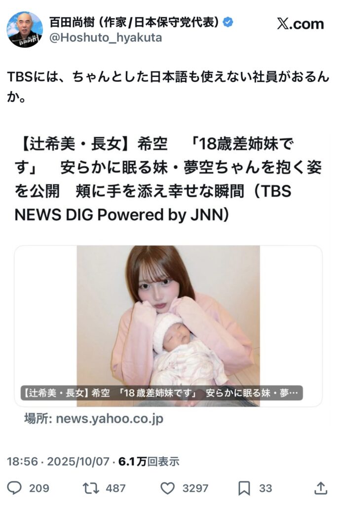 【悲報】辻希美さんの長女が第5子を抱くショットを公開→TBS「安らかに眠る妹」と書いてしまう