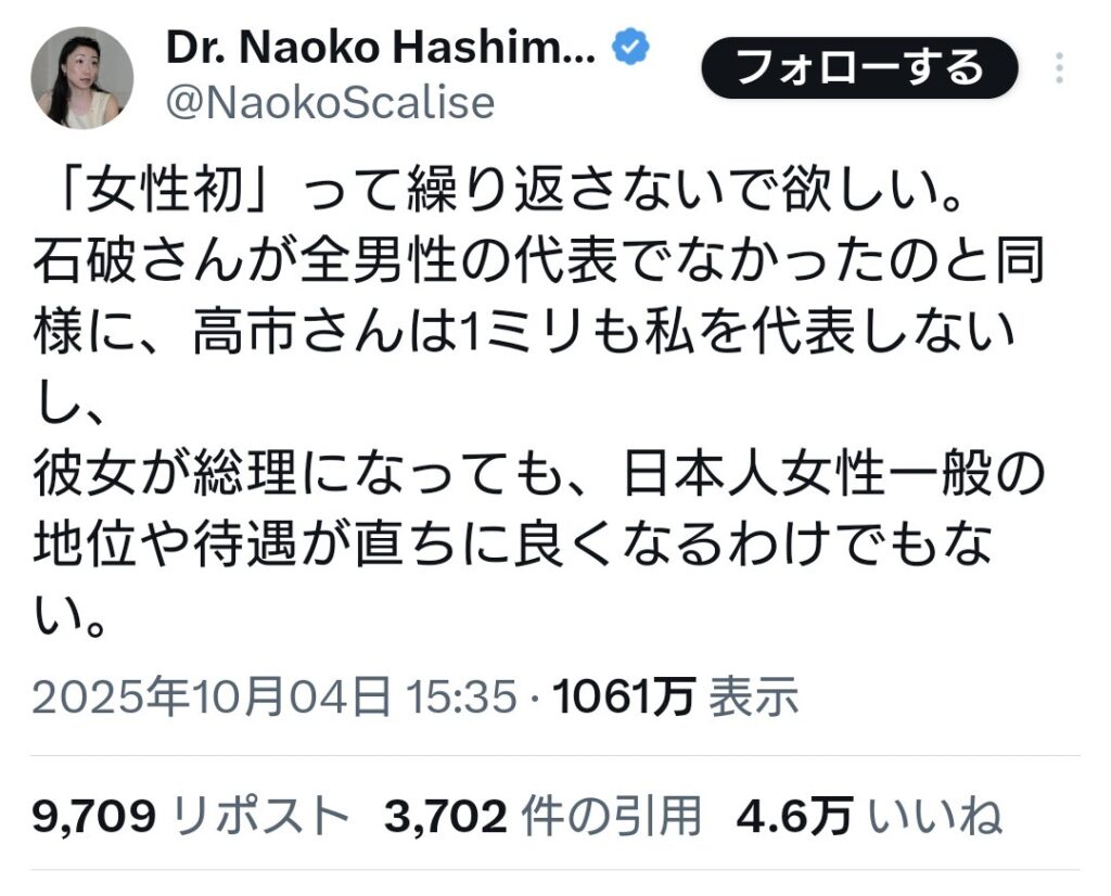 フェミさん「女性初、って繰り返さないで欲しい。高市さんは1ミリも私を代表していない」