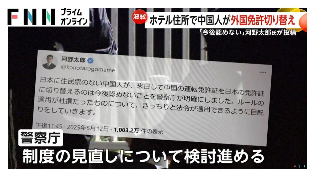 【X】河野太郎氏「中国の運転免許証を切り替えるのは認めないことを警察庁が明確に... -
