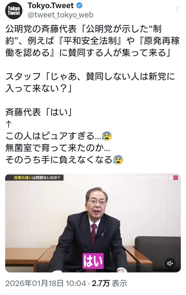 スタッフ「じゃあ平和安全法制や原発再稼働に賛同しない人は新党に入って来ない?」→斉藤代表「はい」