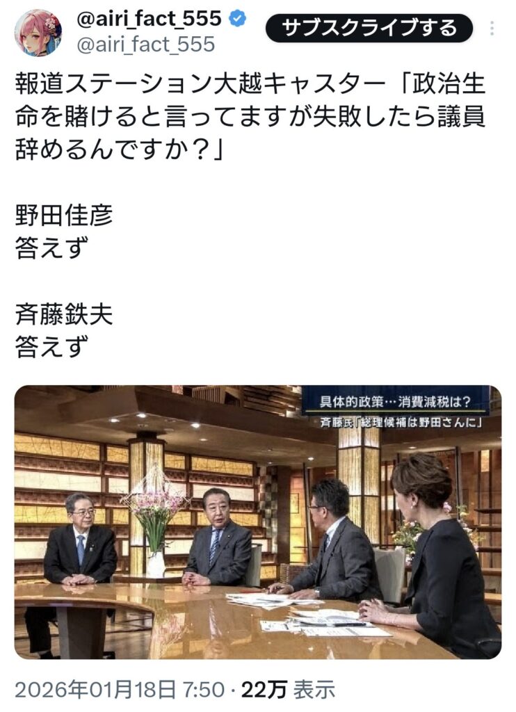大越氏「政治生命を賭けると言ってますが失敗したら議員辞めるんですか?」 →野田・斉藤氏答えず